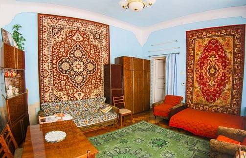 Мне больше всего понравились тщательно отработанные углы под потолком: в такой потолок плевать затруднительно, тем более, что там все 4 метра в высоту, не меньше. Дополнительно люблю вот этот юрта-стайл, шоб побольше ковров везде, и разноцветных. Совецкие мебеля и железные карнизы - прямо как колбаса за 2.20! А неоновый светильник висел у нас на работе и приятно гудел весь день, и мигал! Трельяж установлен неправильно: обычно центральное зеркало наклонялось вперед само. Пластмассовые листики по стенам очень живенько, прямо как на кладбище. Наверняка в серванте стоит синий питейный набор Рибка.